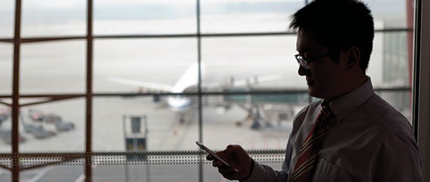 Cuando finalmente usted llega a la puerta, acerca su teléfono a un lector en el puesto de auto-embarque y entra el avión. Saca su dispositivo una última vez antes del despegue para chequear el estado de su equipaje.