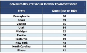 Illinois quedó en el último lugar como el estado menos seguro en cuanto a identidad. Este estado tiene que trabajar en las áreas de gestión de identidad de tarjetas de beneficios, prácticas eGov, documentos primarios de identidad, y documentos de identidad de salud y seguridad. Carolina del Norte, que quedó en penúltimo lugar, también tiene que realizar un trabajo significativo con respecto a la gestión de identidad de tarjetas de beneficio. Ambos estados utilizan aún tarjetas en papel para distribuir los fondos de asistencia pública, las cuales son inseguras y limitan la interoperabilidad.